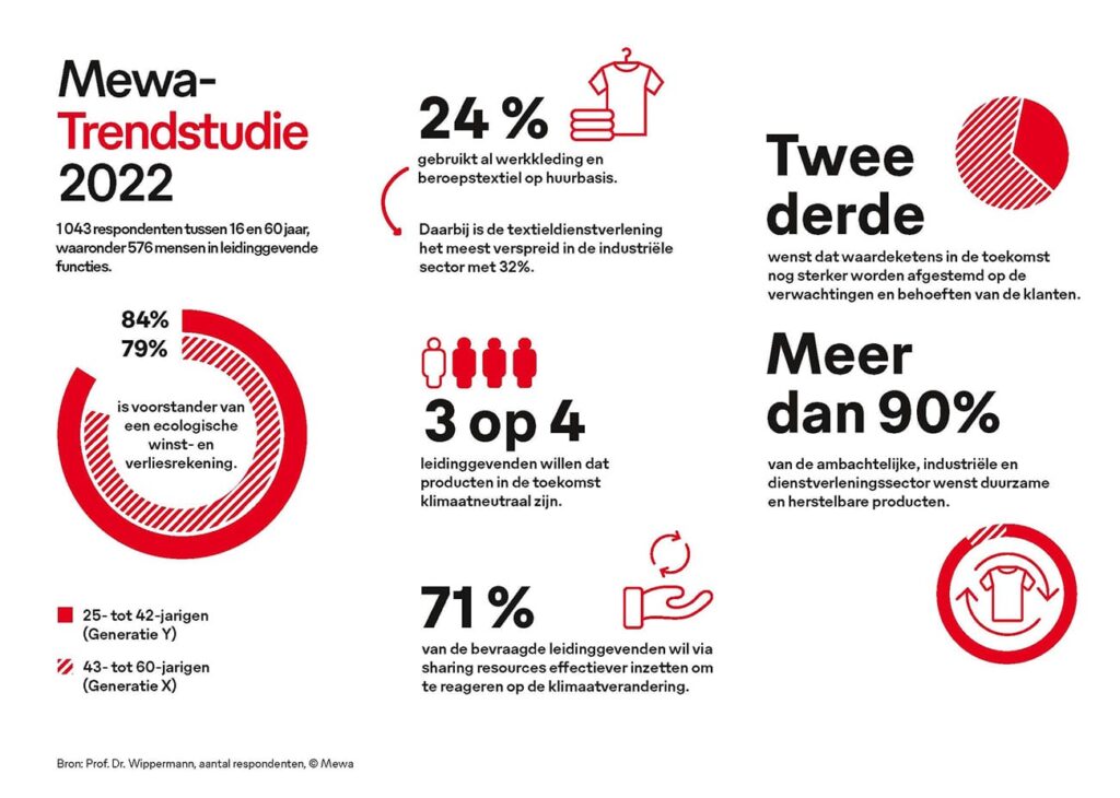 In het trendonderzoek van Mewa in Duitsland geeft 24 procent van de respondenten aan dat hun werkgever al gebruikmaakt van deze mogelijkheid. Iets minder dan een derde (27%) van alle respondenten zegt dat zij het op prijs zouden stellen als een textieldienstverlener de textieluitrusting voor hun job voor hun rekening zouden nemen. Voor bijna twee derde (63%) van de respondenten is een van de belangrijkste argumenten om werk- en beroepskleding te delen het feit dat “je je geen zorgen hoeft te maken over  reparaties”.
