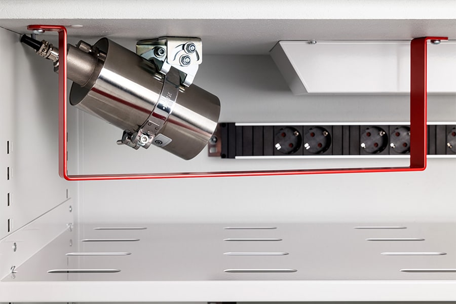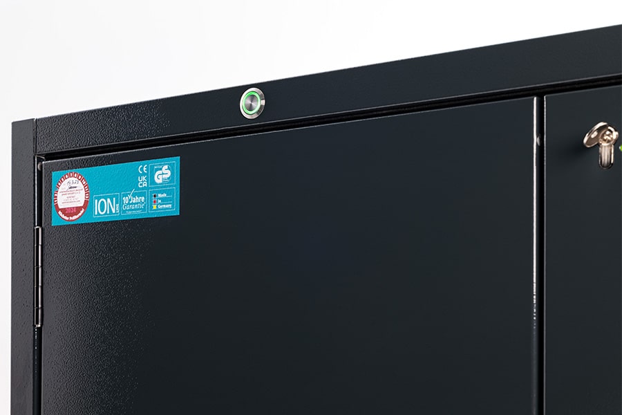 Doordat Asecos in een vroeg stadium is gestart met de ontwikkeling van brandwerende kasten voor de opslag en/of het opladen van lithium-ion-accu’s, voldoen hun producten nu al volledig aan de nieuwe PGS 37-richtlijn. “Onze kasten voldeden al aan de EN-14470-1 norm, die onder meer bepalen dat de brandwerendheid van buiten naar binnen minimaal negentig minuten moet zijn. Maar aangezien een lithium-ion-batterij haar eigen zuurstof produceert, hebben wij deze brandwerendheid óók van binnen naar buiten gecreëerd.” Daar deed Asecos nog een flinke schep bovenop door haar lithium-ion-kasten van alarmdetectie te voorzien en ze rookdicht en explosiebestendig te maken. Daarnaast is Asecos de enige producent wiens kast conform het GS beginsel EK5/AK4 22-01 gecertificeerd is.