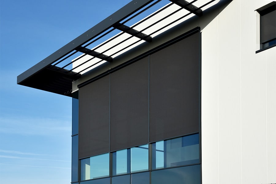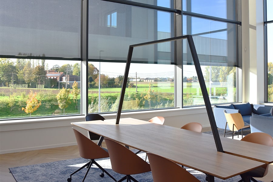 Een vliesgevel geeft gebouwen onmiddellijk een esthetische meerwaarde. Zo ook bij de vestiging van Prosafco. Maar voor dergelijke grote glaspartijen dient men naast esthetiek ook oog te hebben voor functionaliteit. Niemand werkt immers graag in een gebouw waar de temperaturen tijdens de zomer de hoogte worden ingejaagd. Daarom is het des te belangrijker dat het binnencomfort evenveel aandacht krijgt. Door de grote glasramen te voorzien van functionele DucoScreen Front 150 CW-doekzonwering wordt geen afbreuk gedaan aan de stijl en het uiterlijk van de gevel. Integendeel: esthetiek en functionaliteit gaan hand in hand.