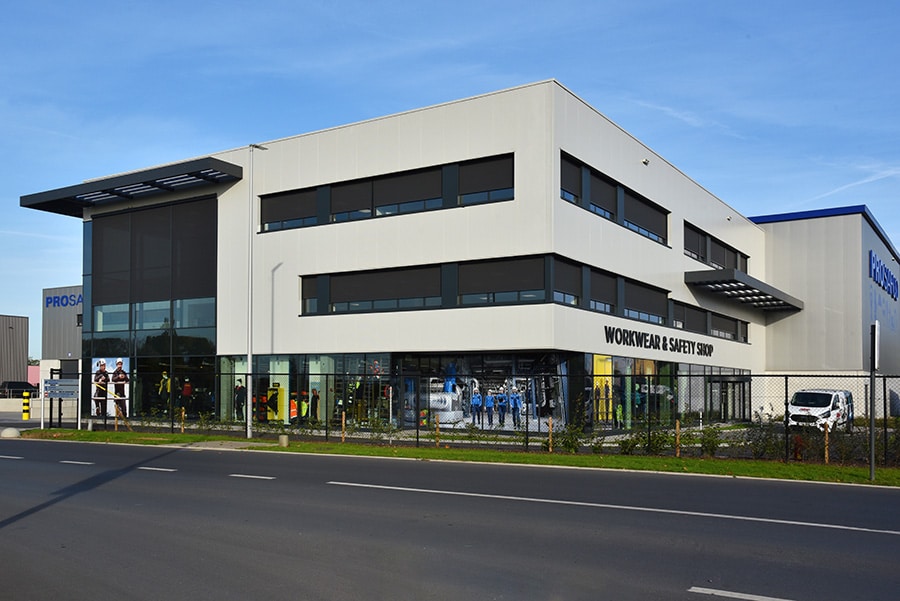 Prosafco is een toonaangevend bedrijf uit Roeselare, dat gespecialiseerd is in workwear & safety. Dankzij hun expertise en groot aanbod aan werkkledij, werkschoenen, handschoenen en andere persoonlijke beschermingsmiddelen helpen ze vakmensen dag na dag letselvrij thuis te komen. Om hun kantoormedewerkers te beschermen tegen oververhitting en verblindende zonnestralen werd de gevel van het gebouw uitgerust met DucoScreen Front 150 Curtain Wall-doekzonwering.